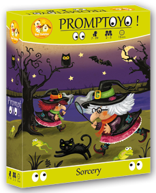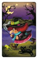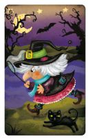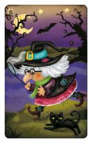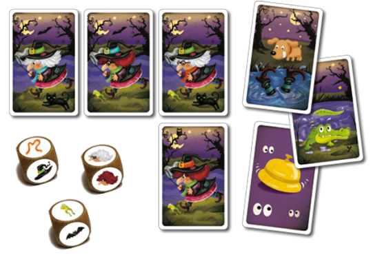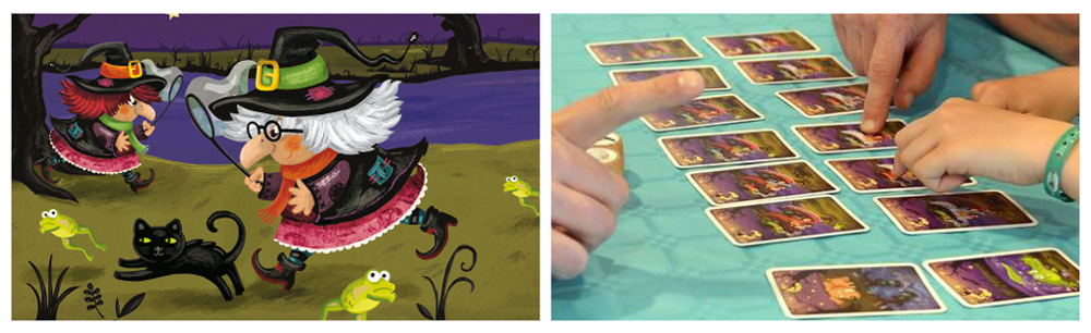 On lance les 2 dés. Un dé indique la tête de la sorcière et l'autre la couleur de l'écharpe ou du chapeau. Dans l'exemple à gauche, il faut retrouver la sorcière aux cheveux blancs sans lunettes qui porte une écharpe bleue. Le premier qui tape la bonne carte avance d'une case.